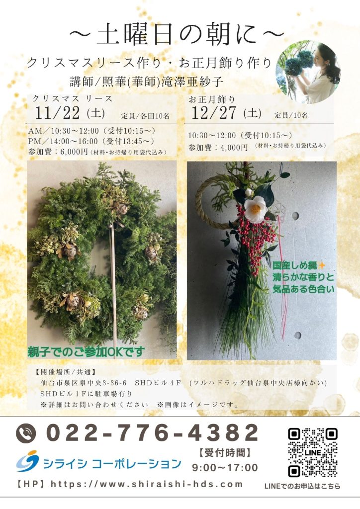 【シライシコーポレーション】~土曜日の朝に~照華(華師)滝澤亜紗子先生の🎄クリスマスリース作りと🎍お正月飾り作り