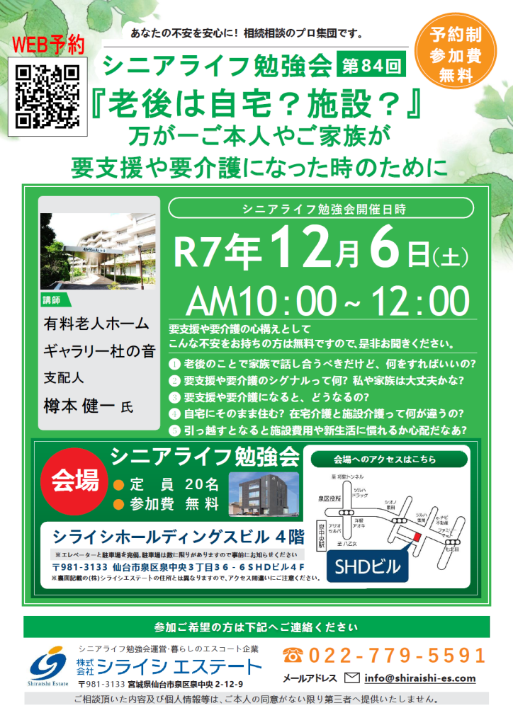 【シライシエステート】第84回シニアライフ勉強会「老後は自宅?施設?」開催のお知らせ 2025.11.14 / NEWS 2025年12月6日(土)午前10時より第84回シニアライフ勉強会を開催します。 テーマは「老後は自宅?施設?」 講師は有料老人ホーム「ギャラリー杜の音」様です。 参加費は無料、定員20名、予約制となっております。 たくさんのご応募をお待ちしております。 WEB予約:下記のチラシをクリック 電話予約:022-779-5591 «前へ